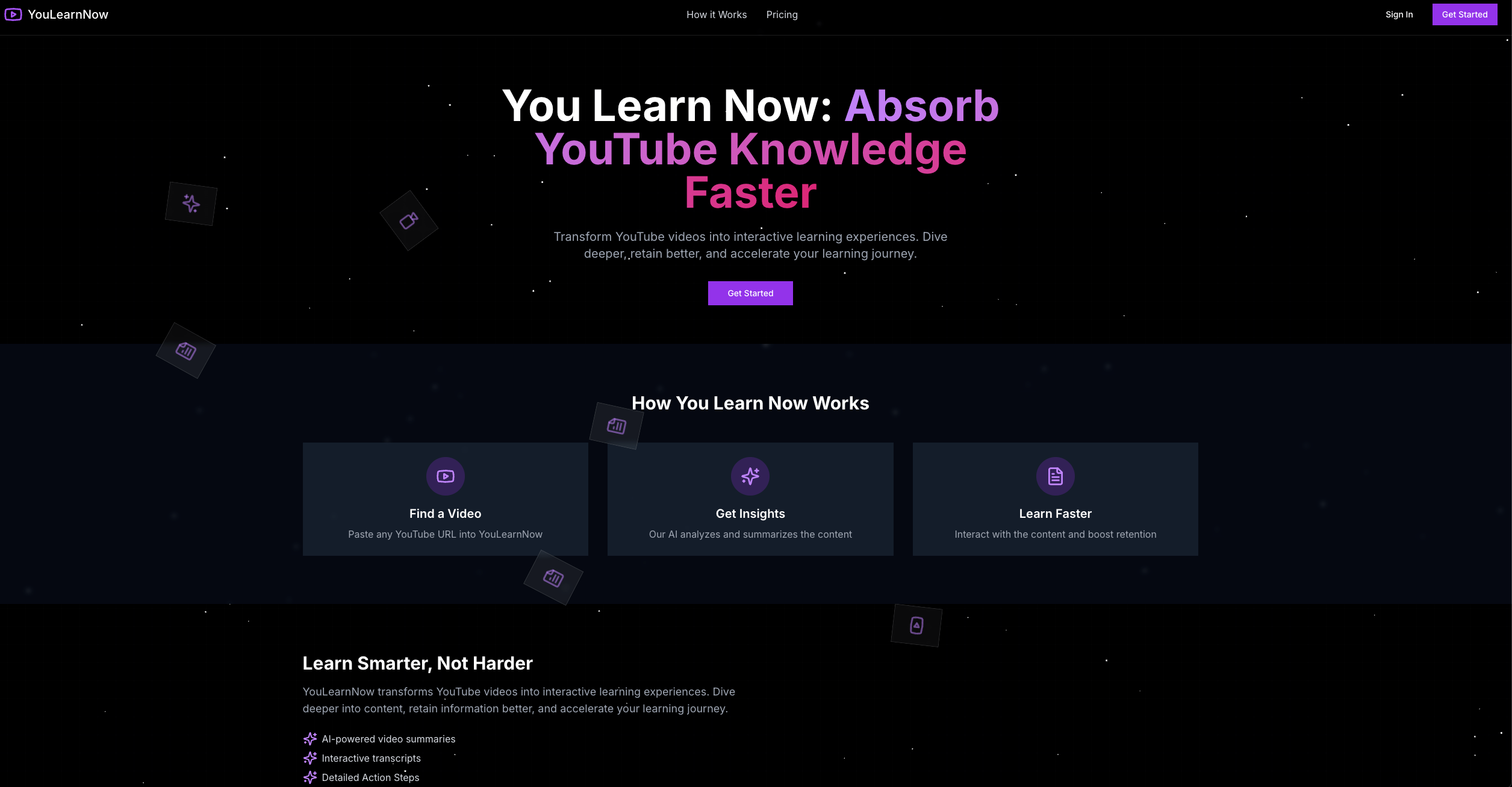 The idea for YouLearnNow actually came from my own issues. I love learning from YouTube, whether it be how to start a business, how to manage finance, how to market, etc. However, oftentimes I would struggle as I had no way to quickly get the summaries and main points of the videos in order to take action on the advice. That is when the idea of YouLearnNow was born.