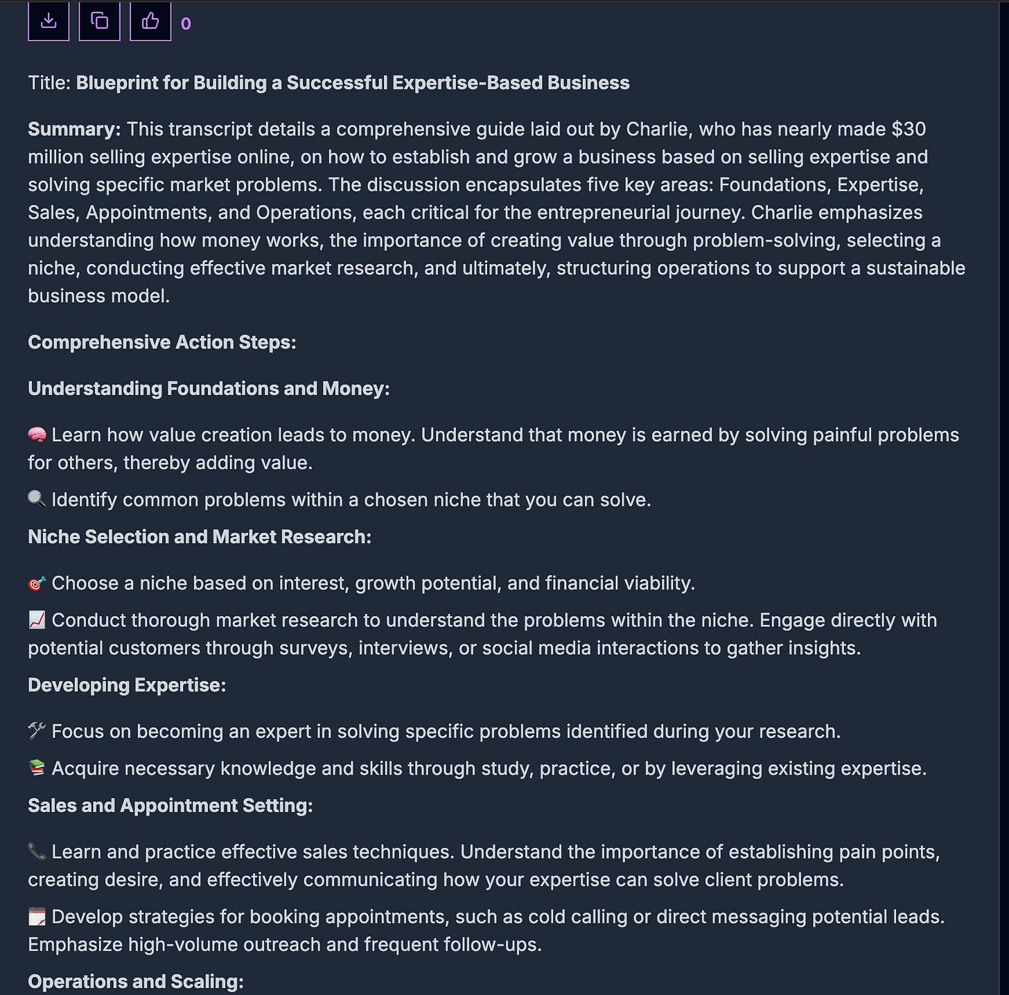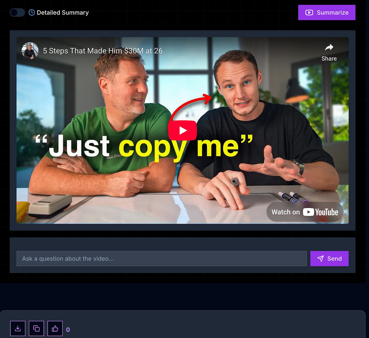 9. Click Summarize and get your summary and action steps10. Download your content or chat to the Ai model for further advice on the video and how to implement the advice for your own business or idea.