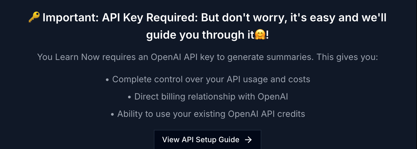 For the pricing model, I decided to break away from conventional monthly subscriptions as I prefer a one-time payment. However, since I use AI models I get charged for each query or lookup. So I decided to use a “Pay Once and Have Lifetime Access” pricing model, but the user has to use their own API key. My concern for this approach was that users may be intimidated by creating their own API key, which may cause friction. In order to tackle this, I added the following in my pricing page, which tells the user the benefits of using their own API key and that they do not have to worry, as we will guide them through the setup. The guide can also be found here