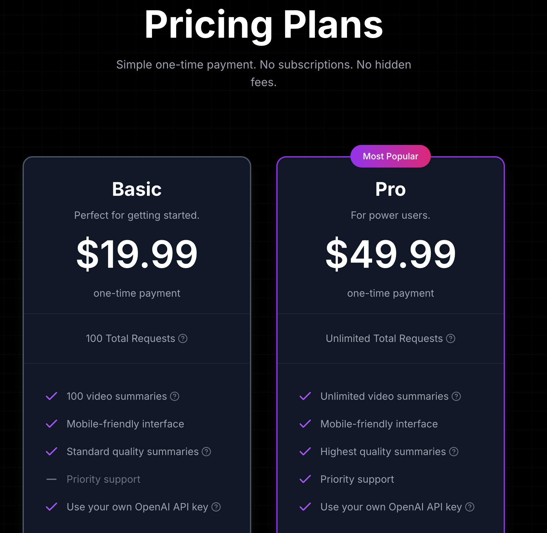 My hope is that people would prefer to have lifetime access for a single payment and use their own API Keys rather than having monthly recurring payments. But only time will tell 🕝. For the pricing, there are 2 options: Basic and Pro.